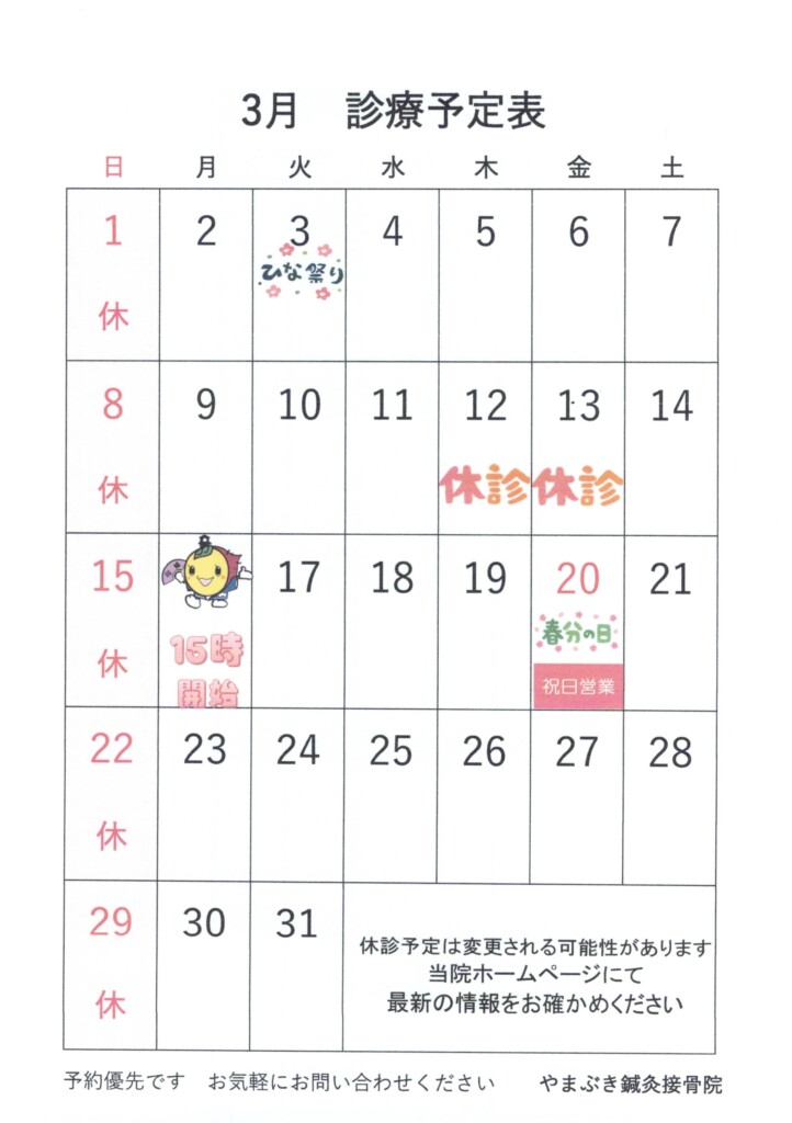 3月の診療予定表ができました